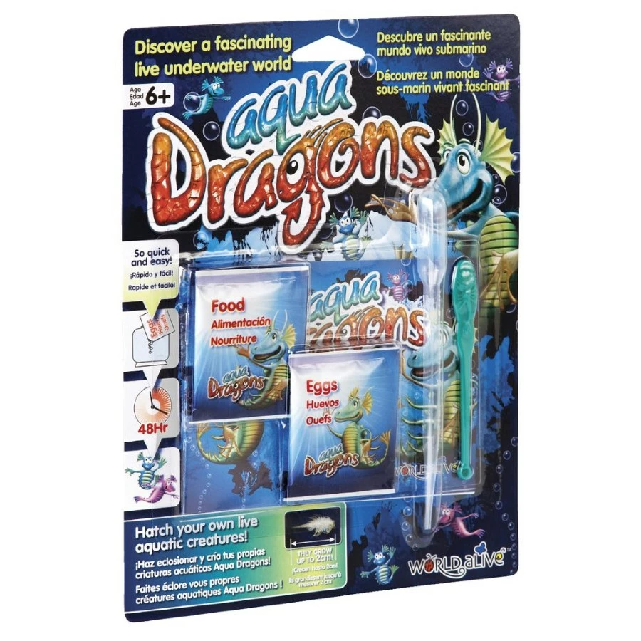 Welcome to the world of Aqua Dragons. You can now bring to life these magical, little 200 million-year-old aquatic animals. Your friends will be amazed and will want to join in the fun. All you need to get started is a tank that fits approximately 400 grams of water and this Aqua Dragon Refill Kit. It includes; one sachet of Aqua Dragon Eggs, one sachet of Aqua Dragon Food, one feeding spoon, one pipette and an instruction booklet. Fill the tank with water and then empty the eggs into the water. They will hatch within 24 hours, and you can watch them come to life. You will have new Aqua Dragons pets in your tank in no time. The three-eyed, long-tailed funny little swimming animals will surprise your friends and provide many hours of play as they need taking care of so that they can survive. Don’t forget to look after them by feeding them with the food provided because they can even reproduce in the tank. Recommended for ages 6 and over. Batteries are not required.