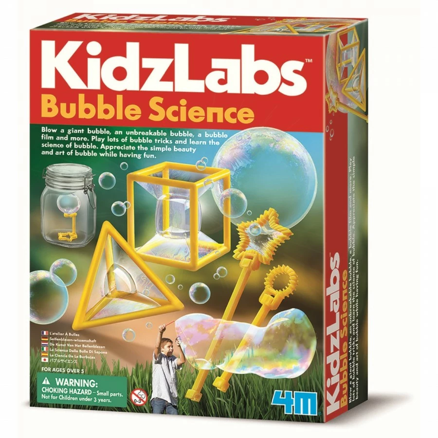 This 4M Kidz Lab Bubble Science kit allows your child to have fun experimenting and creating different types of bubbles. This is a science-based activity that offers a learning experience while making the learning process fun at the same time. Two main things are required to blow bubbles: the liquid made from soap and the wand or the stick you blow the bubbles out of. Stick the wand into the bubble liquid and then blow gently into the end of the wand. The shape of the wand end can influence the formation of the bubbles produced. Bubbles are just a thin layer of soap and water around a pocket of air. Experiment with this 4M Kidz Lab Bubble Science kit to make all types of bubbles from different wand shapes. This set contains the bubble liquid, a tray to hold the liquid, wands of different shapes and other objects which can capture the bubble liquid before it is blown into to produce the bubbles. Suitable for ages 5 and up.